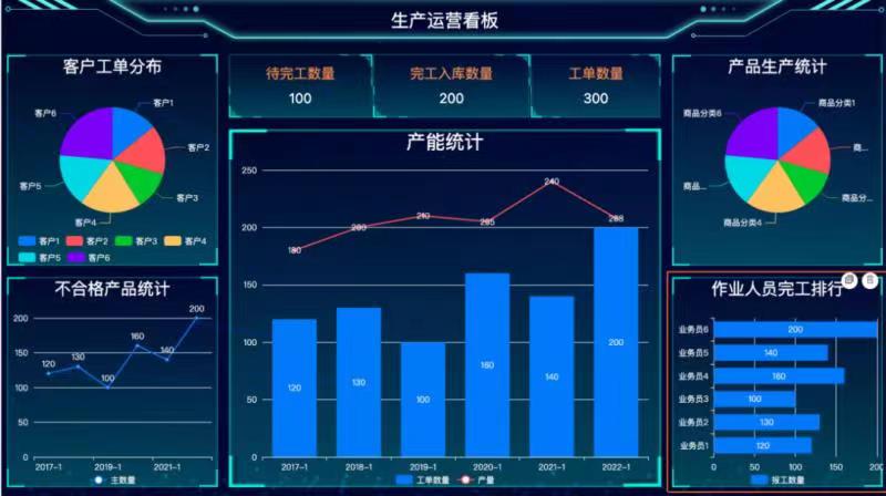 生產看板支持趨勢圖、餅圖、指標卡、排行榜等多種可視化數(shù)據(jù)展示樣式,也預置了多套精美皮膚供選擇,自定義的看板可發(fā)布為菜單,單獨授權給老板、廠長、車間、庫管、品控等多用戶角色使用, 看板支持在大屏、電腦端、工控機、車間電視等多端展示。
