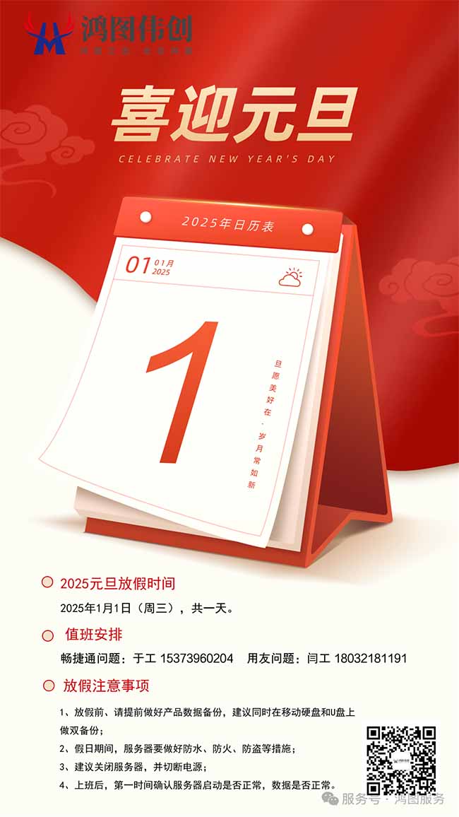 首頁 > 石家莊用友軟件 > 【假期】2025年鴻圖偉創(chuàng)元旦放假及值班安排