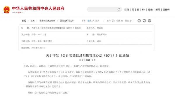 據石家莊用友軟件了解,日前,財政部正式印發(fā)《會計獎懲信息歸集管理辦法(試行)》,宣布自2025年7月1日起,全國會計人員的表彰獎勵和行政處罰信息將被錄入全國會計人員統(tǒng)一服務管理平臺。