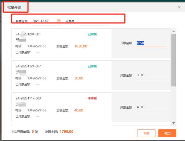 2.勾選要進行開票的單據(jù),點擊表體右上角的【開票】,輸入發(fā)票號、開票日期等數(shù)據(jù),即可對多張單據(jù)進行開票處理。