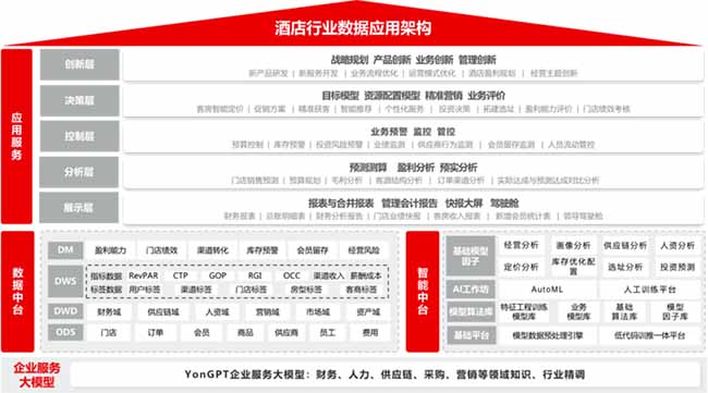 以YonGPT企業(yè)大模型為支撐,通過用友iuap數(shù)據(jù)中臺對酒店企業(yè)的人、財、經(jīng)營、營銷、資產(chǎn)、供應(yīng)鏈等多元業(yè)務(wù)數(shù)據(jù)進行匯聚和治理,并圍繞核心業(yè)務(wù)線的經(jīng)營、管理、會員、運營等重要指標(biāo)構(gòu)建分析體系,利用智能中臺的模型算法庫訓(xùn)練、構(gòu)建的酒店行業(yè)模型因子,為酒店企業(yè)提供5層全面數(shù)據(jù)服務(wù),深入洞察企業(yè)運營、識別潛在的業(yè)務(wù)風(fēng)險和機會,并提供智能化的解決方案,從而提高經(jīng)營決策水平和業(yè)務(wù)運營效率。