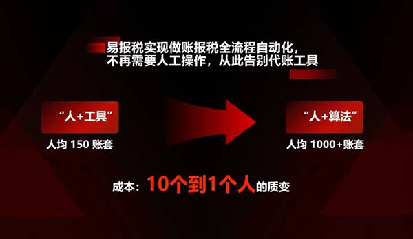暢捷通直擊行業(yè)痛點(diǎn):傳統(tǒng)代賬模式下,企業(yè)深陷價(jià)格戰(zhàn)激烈、同質(zhì)化競(jìng)爭(zhēng)、合規(guī)要求提升及客戶需求變化等。面對(duì)這些挑戰(zhàn),易報(bào)稅以“人+算法”的新模式,為代賬企業(yè)提供了開源節(jié)流的解決方案。