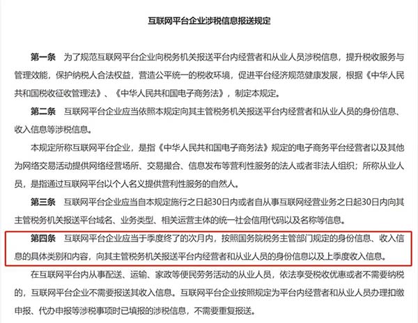 近日,《互聯(lián)網(wǎng)平臺企業(yè)涉稅信息報送規(guī)定》正式出臺實施,一石激起千層浪,社會各界對此廣泛關(guān)注。那么,這項新規(guī)究竟藏著哪些變化?又將對哪些群體產(chǎn)生深遠(yuǎn)影響?
