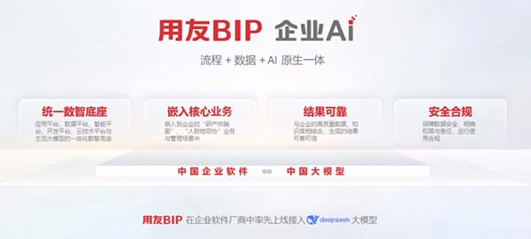 年初,用友BIP企業(yè)AI的發(fā)布,為企業(yè)應(yīng)用AI提供了落地抓手。面對眾多企業(yè)在系統(tǒng)分散、數(shù)據(jù)孤島中的困境,用友結(jié)合企業(yè)AI的四大特性——統(tǒng)一數(shù)智底座、嵌入核心業(yè)務(wù)、結(jié)果可靠、安全合規(guī),提出了一個(gè)關(guān)鍵性命題:真正有效果的、可持續(xù)輸出價(jià)值的AI,必須扎根于“原生一體化”的土壤之中。