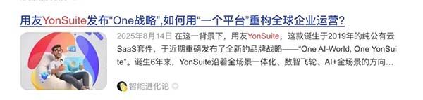 它提出的“雙One”,既是對未來的宏大描繪,也是對自身角色的精準(zhǔn)定位:One AI-World,勾勒AI驅(qū)動(dòng)的新商業(yè)世界;One YonSuite,宣示成為全球成長型企業(yè)最優(yōu)核心平臺的決心,也意味著一次 All-in-ONE 的戰(zhàn)略升級。